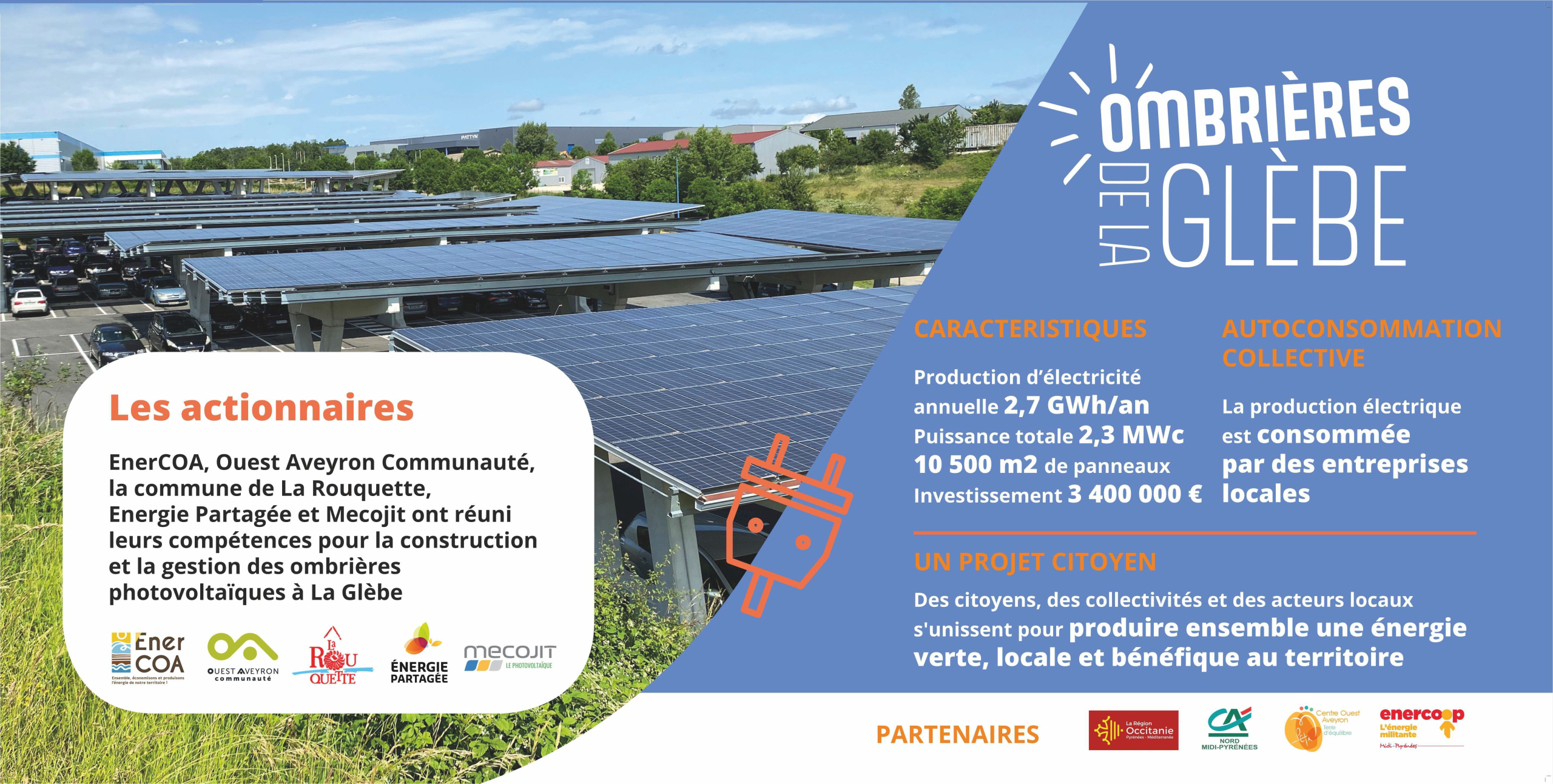 Vendredi 26 septembre 2025, les acteurs des Ombrières de La Glèbe ont inauguré le plus grand projet citoyen d’autoconsommation collective de France, sur le site de la ZA de La Glèbe à La Rouquette (Aveyron). Cette réalisation est portée par la SAS Ombrières de La Glèbe, qui rassemble la coopérative citoyenne EnerCOA, la communauté de communes Ouest Aveyron Communauté, le mouvement national de l’énergie citoyenne Énergie Partagée, la commune de La Rouquette, et l’entreprise locale MECOJIT.