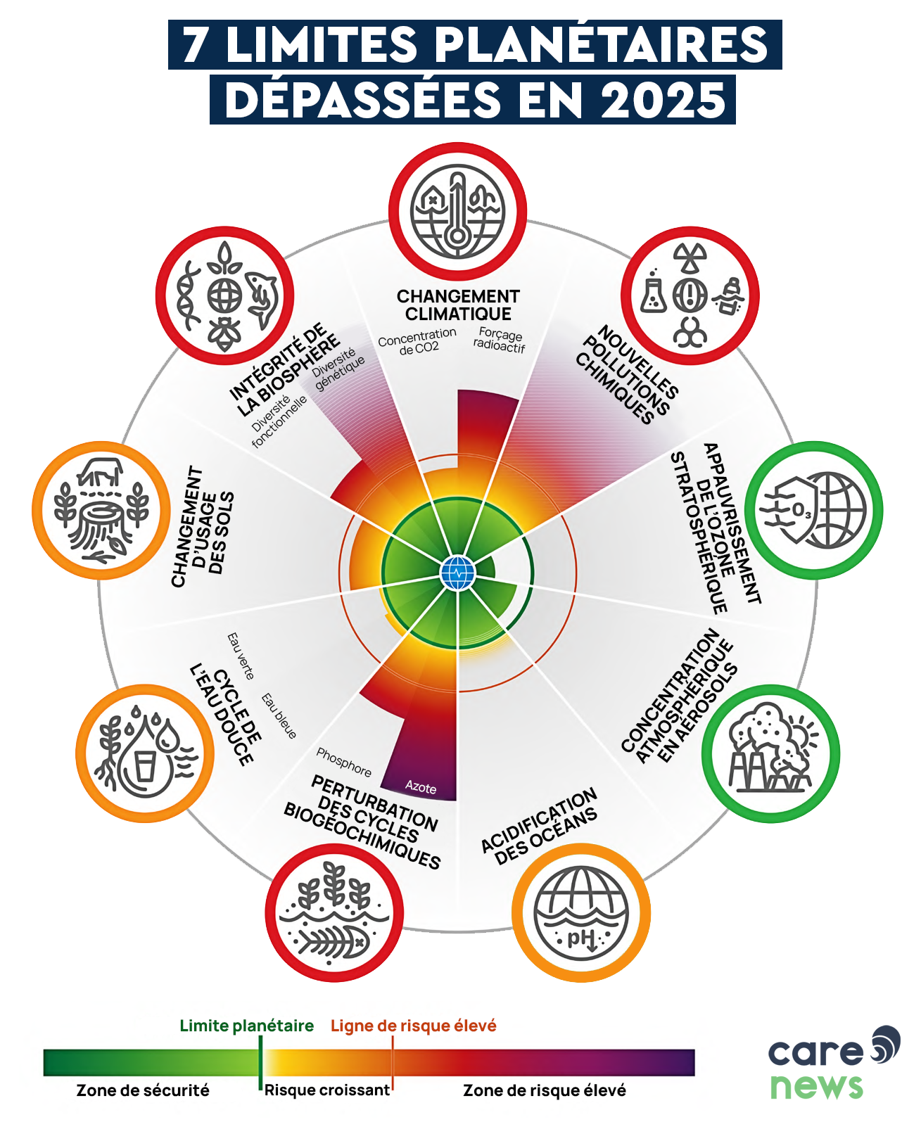 Neuf limites planétaires ont été définies, car ensemble elles remettent en cause la stabilité de la biosphère, dont huit sont chiffrées par les chercheurs et sept sont déjà franchies : érosion de la biodiversité, flux biochimiques, changement d’affectation des sols, réchauffement climatique (depuis 2015), pollution par des substances nouvelles, perturbation du cycle de l’eau douce (depuis 2022), acidification des océans (depuis 2025).